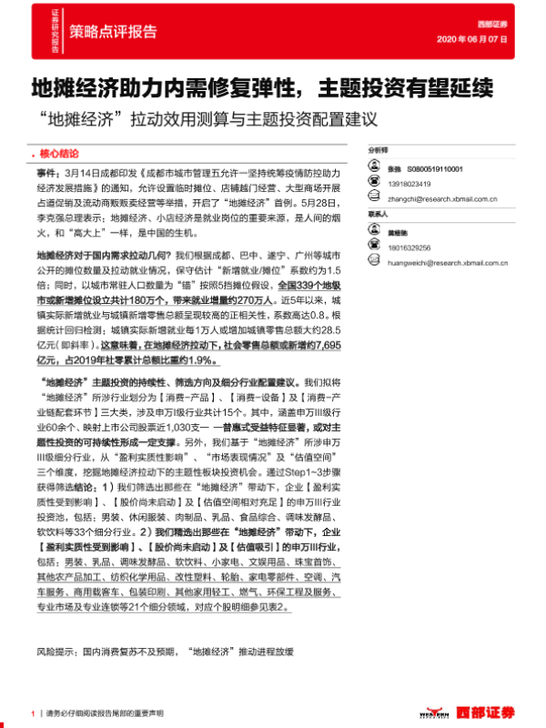 【西部证券】【20200607】“地摊经济”拉动效用测算与主题投资配置建议:地摊经济助力内需修复弹性,主题投资有望延续-12页 行业研究