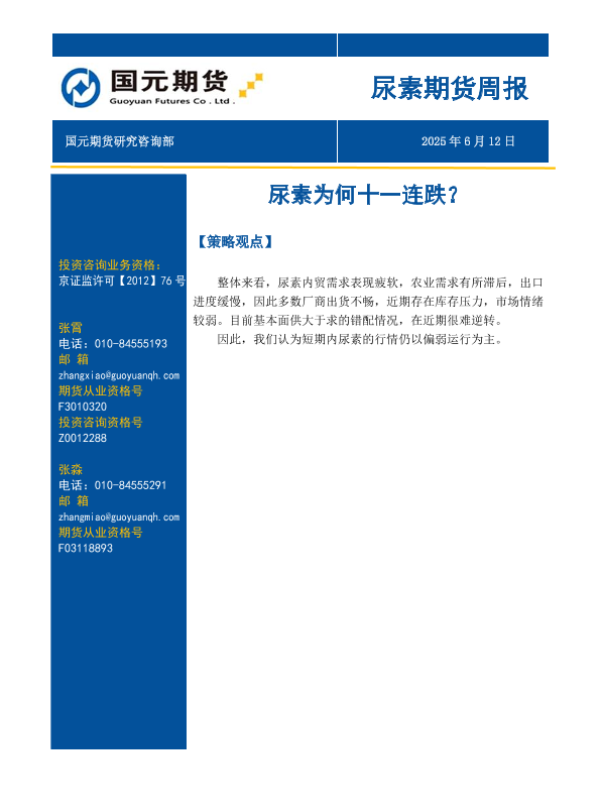 【国元期货】【20250612】尿素期货周报_尿素为何十一连跌-8页 证券期货研究报告