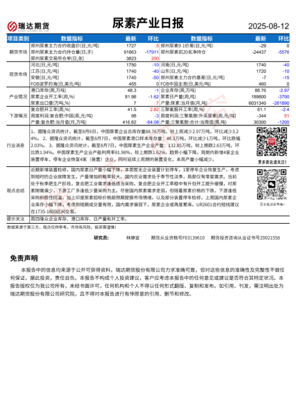 【瑞达期货】【20250812】尿素产业日报-1页 证券期货研究报告