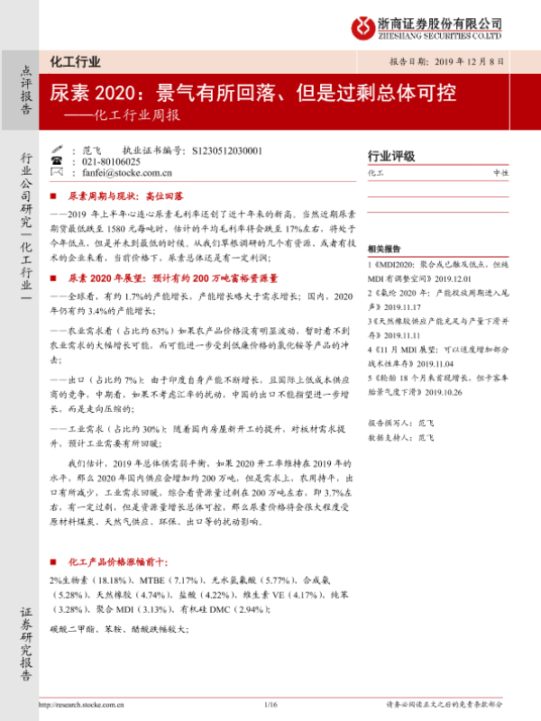 【浙商证券】【20191208】20191208-浙商证券-化工行业周报:尿素2020:景气有所回落、但是过剩总体可控-16页 行业研究