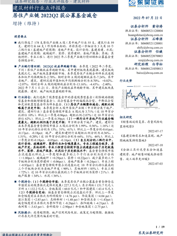 【东吴证券】【20220722】建筑材料行业点评报告:居住产业链2022Q2获公募基金减仓-19页 行业研究