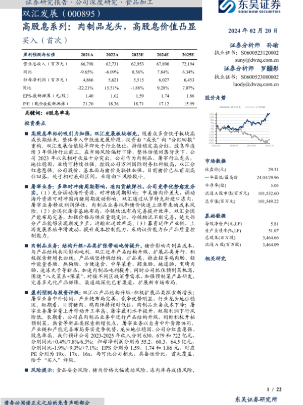【东吴证券】【20240220】双汇发展:肉制品龙头,高股息价值凸显-22页 行业研究