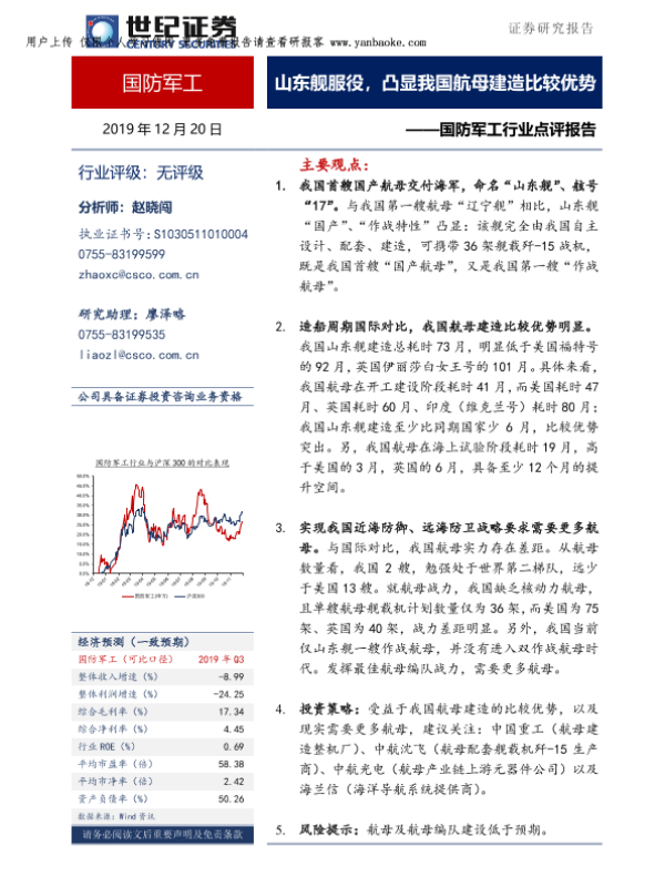 【世纪证券】【20191220】国防军工行业点评报告:山东舰服役,凸显我国航母建造比较优势-10页 行业研究