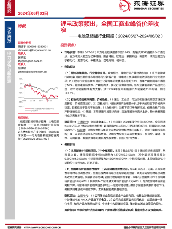 【东海证券】【20240603】20240603-东海证券-电池及储能行业周报:锂电政策频出,全国工商业峰谷价差收窄-12页 行业研究