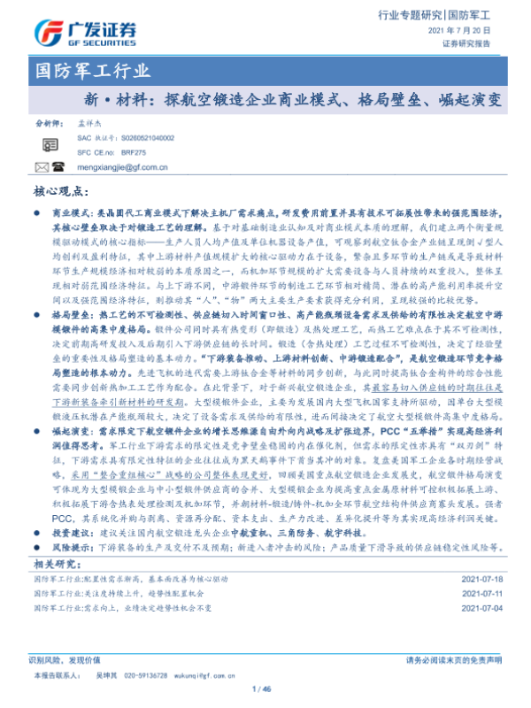 【广发证券】【20210720】国防军工行业:新·材料,探航空锻造企业商业模式、格局壁垒、崛起演变-46页 行业研究
