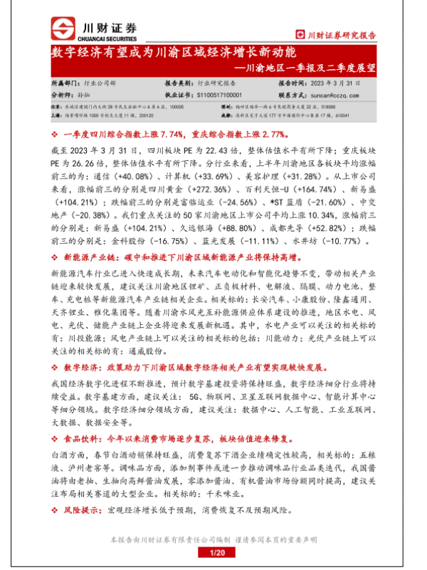 【川财证券】【20230331】消费行业川渝地区一季报及二季度展望:数字经济有望成为川渝区域经济增长新动能-20页 行业研究