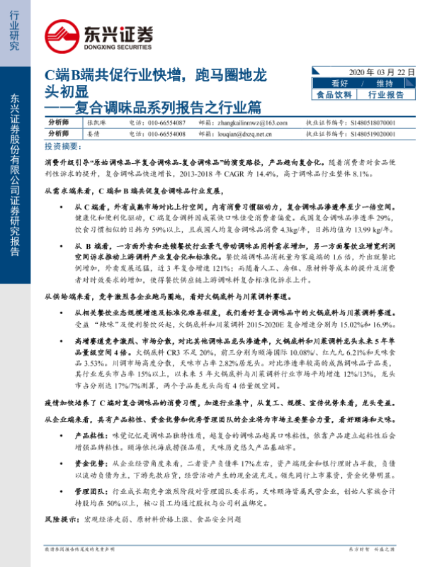 【东兴证券】【20200322】复合调味品系列报告之行业篇 C端B端共促行业快增,跑马圈地龙头初显-21页 行业研究