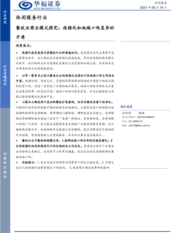 【华福证券】【20210914】休闲服务行业:餐饮业商业模式探究:连锁化和地域口味差异的矛盾-12页 行业研究