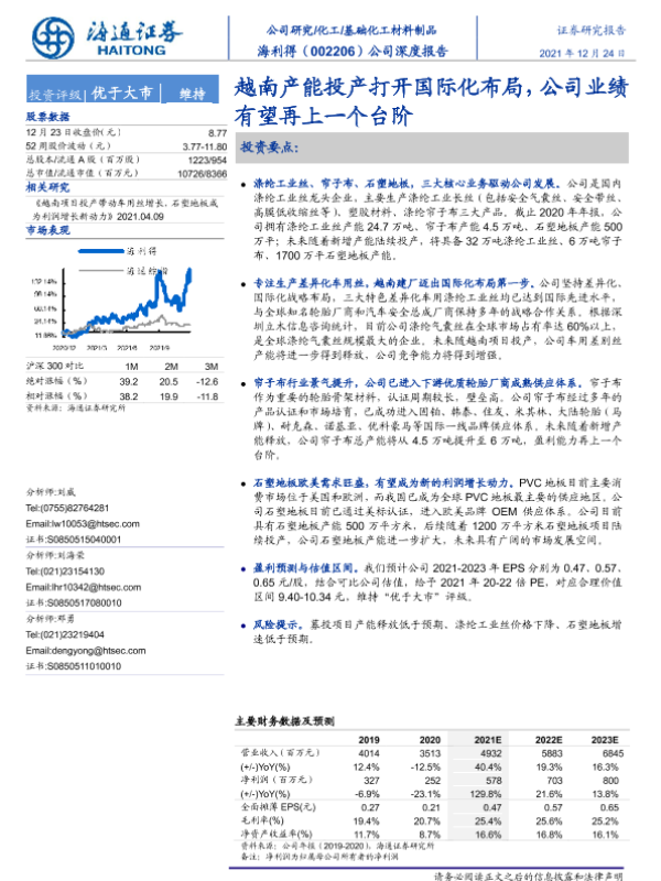 【海通证券】【20211224】海利得-002206.SZ-公司深度报告:越南产能投产打开国际化布局,公司业绩有望再上一个台阶-22页 行业研究
