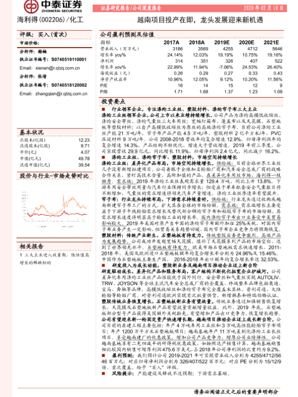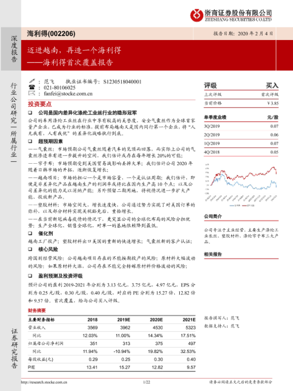 【浙商证券】【20200204】海利得首次覆盖报告:迈进越南,再造一个海利得-22页 行业研究