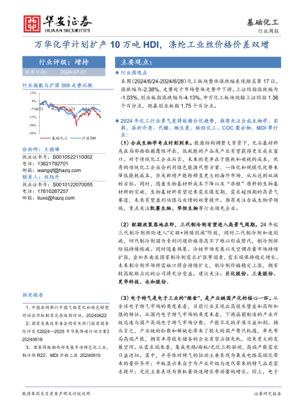 【华安证券】【20240701】20240701-华安证券-基础化工行业周报:万华化学计划扩产10万吨HDI,涤纶工业丝价格价差双增-29页 行业研究