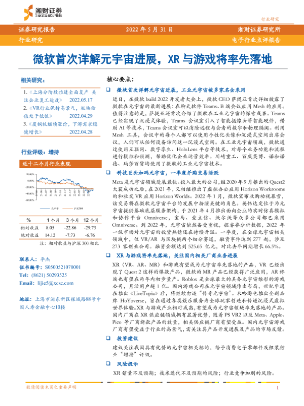 【湘财证券】【20220531】微软首次详解元宇宙进展,XR与游戏将率先落地-2页 行业研究