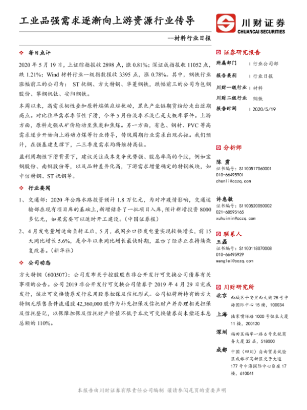 【川财证券】【20200519】材料行业日报:工业品强需求逐渐向上游资源行业传导-3页 证券期货研究报告