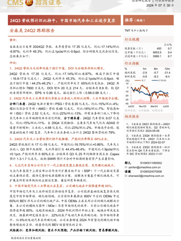【海通证券】【20240730】安森美24Q2跟踪报告-24Q3营收预计环比持平,中国市场汽车和工业逐步复苏-13页 行业研究