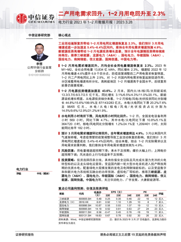 【中信证券】【20230328】电力行业2023年1_2月数据月报:二产用电需求回升,1_2月用电回升至2.3%-16页 行业研究
