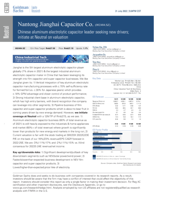 【Goldman Sachs】【20220731】minum electrolytic capacitor leader seeking new drivers; initiate at Neutral on valuation-46页 行业研究