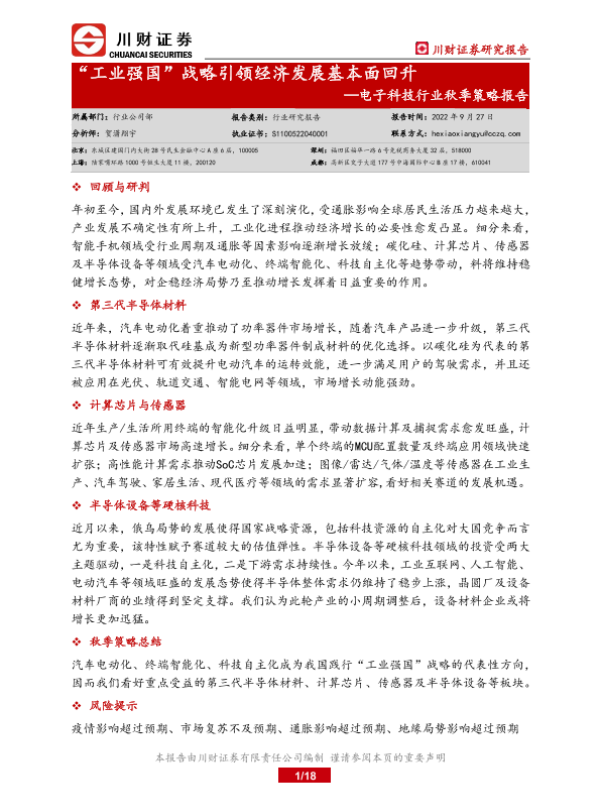 【川财证券】【20220927】电子科技行业秋季策略报告:“工业强国”战略引领经济发展基本面回升-18页 行业研究