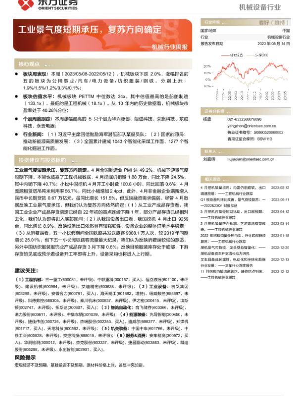 【东方证券】【20230514】机械行业周报:工业景气度短期承压,复苏方向确定-24页 行业研究