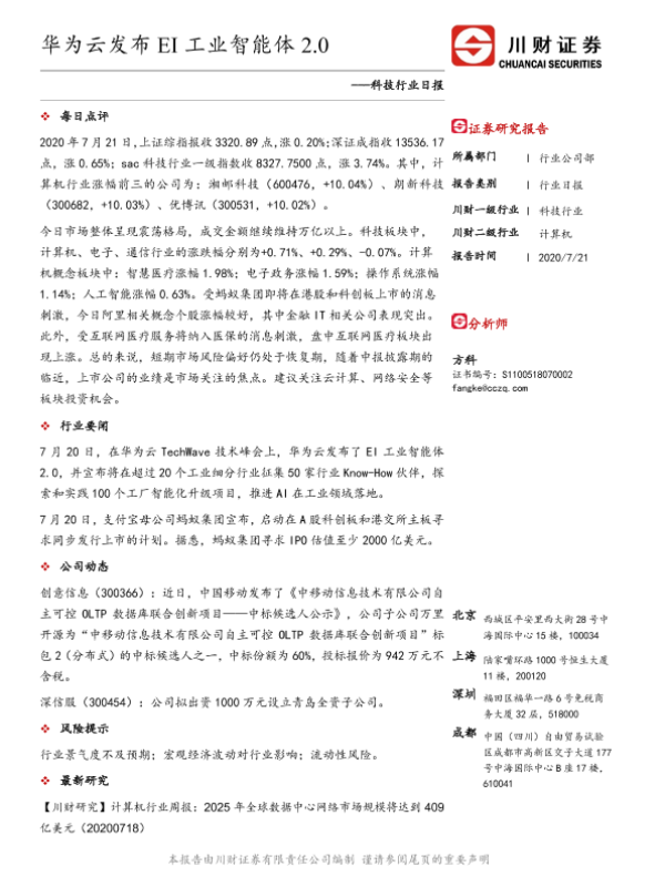 【川财证券】【20200721】科技行业日报:华为云发布EI工业智能体2.0-3页 证券期货研究报告
