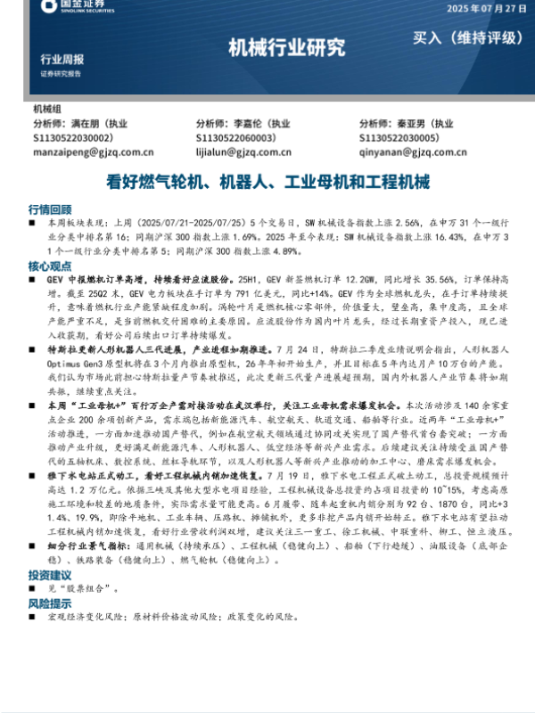 【国金证券】【202507】机械行业研究:看好燃气轮机、机器人、工业母机和工程机械-16页 证券期货研究报告