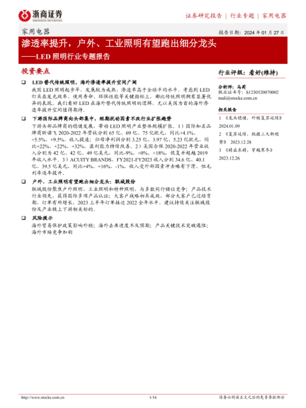 【浙商证券】【20240127】LED照明行业专题报告:渗透率提升,户外、工业照明有望跑出细分龙头-16页 行业研究