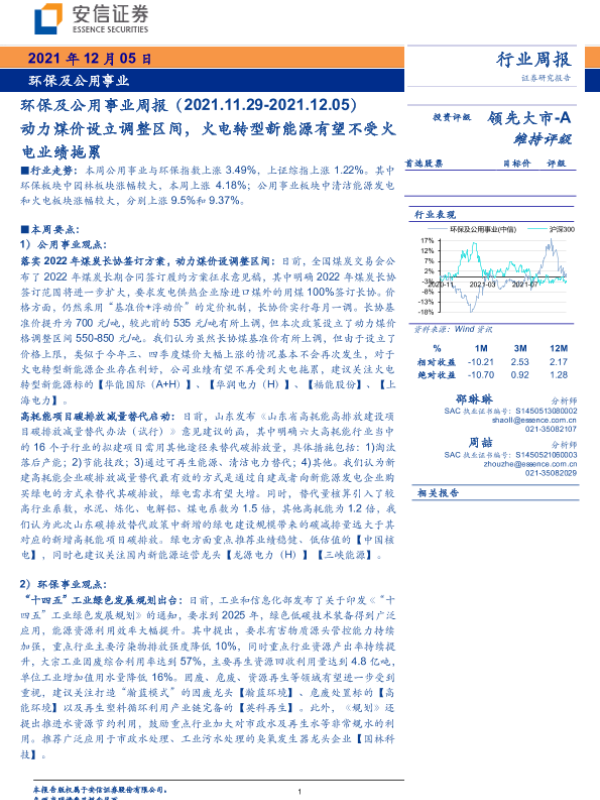 【安信证券】【20211205】环保及公用事业周报:动力煤价设立调整区间,火电转型新能源有望不受火电业绩拖累-17页 行业研究