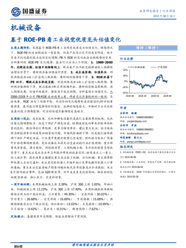 【国盛证券】【20190616】20190616-国盛证券-机械设备行业周报:基于ROE-PB看工业视觉优质龙头估值变化-16页 行业研究