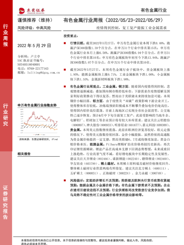 【东莞证券】【20220529】东莞证券-有色金属行业周报:疫情得到控制,复工复产提振工业金属需求-10页 行业研究