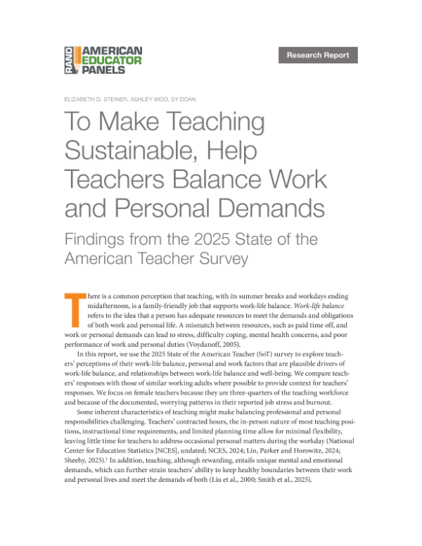 【RAND Corporation】【2025】To Make Teaching Sustainable, Help Teachers Balance Work and Personal Demands-24页 市场调研