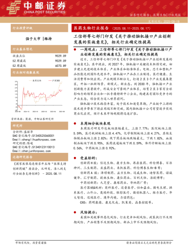 【中邮证券】【20250818】工信部等七部门印发《关于推动脑机接口产业创新发展的实施意见》-相关行业确定性提高-15页 证券期货研究报告