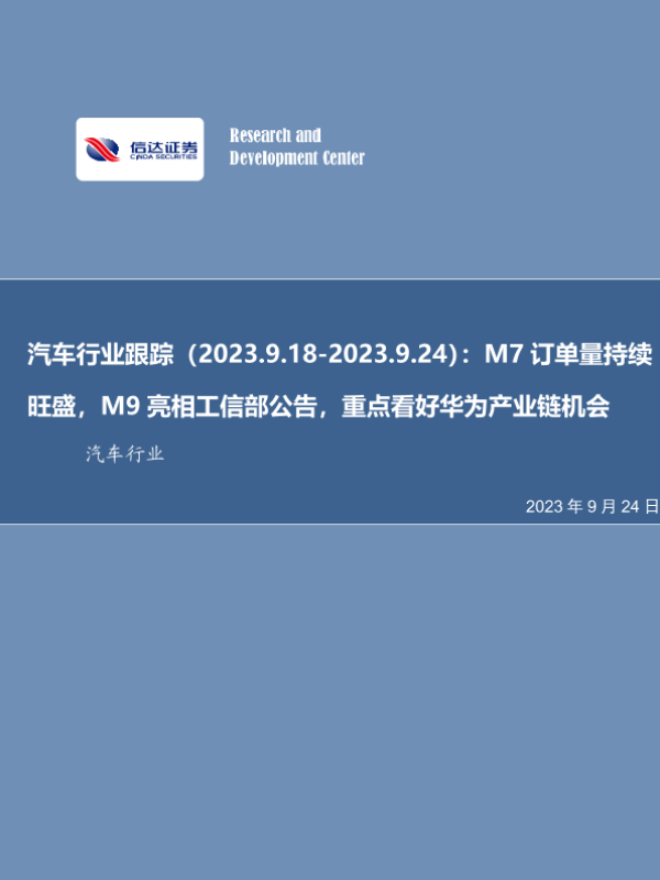 【信达证券】【20230924】汽车行业跟踪:M7订单量持续旺盛,M9亮相工信部公告,重点看好华为产业链机会-24页 行业研究