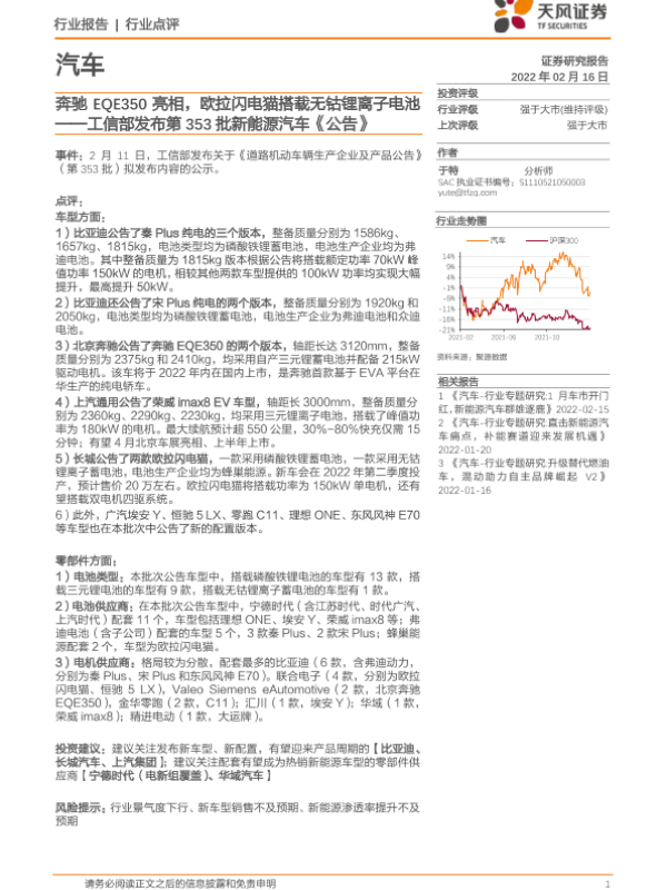 【天风证券】【20220216】汽车行业点评:工信部发布第353批新能源汽车《公告》-奔驰EQE350亮相,欧拉闪电猫搭载无钴锂离子电池-4页 行业研究