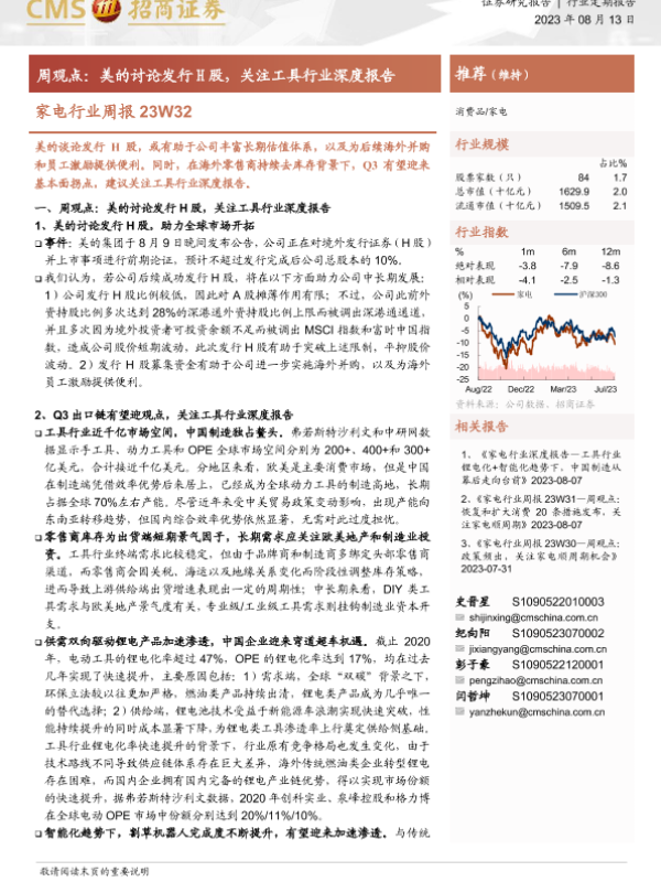 【海通证券】【20230813】家电行业周报23W32:周观点:美的讨论发行H股,关注工具行业深度报告-14页 行业研究