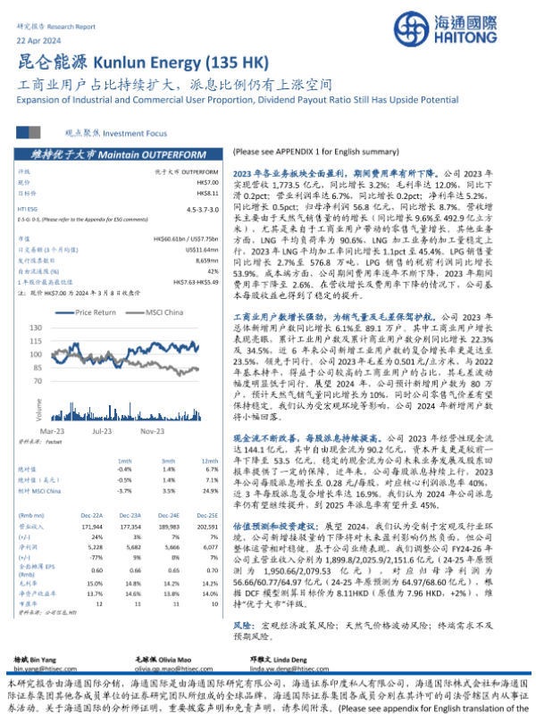 【海通国际】【20240422】昆仑能源(00135.HK)工商业用户占比持续扩大,派息比例仍有上涨空间-10页 行业研究