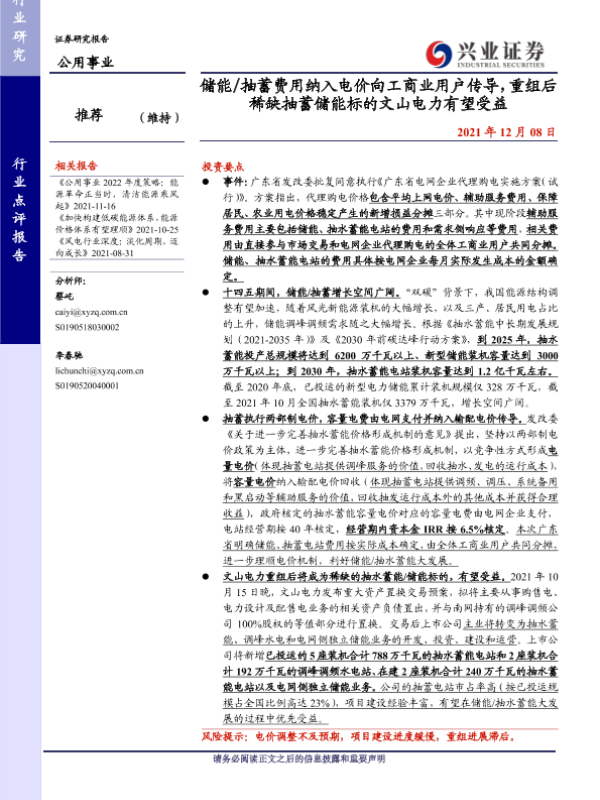 【兴业证券】【20211208】储能/抽蓄费用纳入电价向工商业用户传导,重组后稀缺抽蓄储能标的文山电力有望受益-2页 行业研究