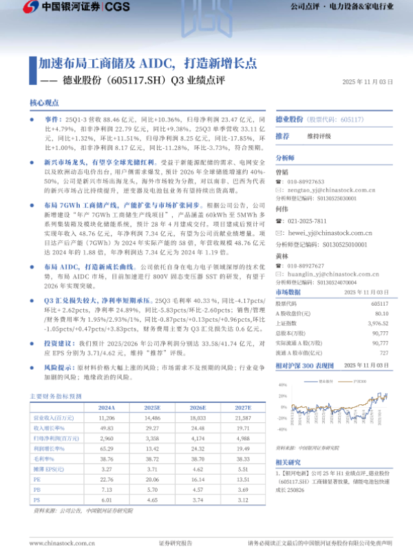 【银河证券】【202511】加速布局工商储及AIDC,打造新增长点——德业股份(605117.SH)Q3业绩点评-3页 证券期货研究报告