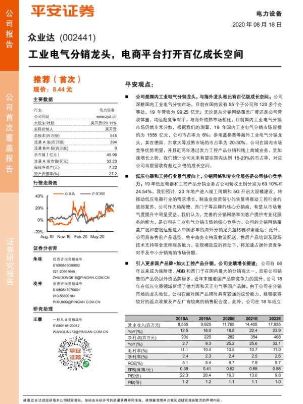 【平安证券】【20200818】众业达-002441.SZ-工业电气分销龙头,电商平台打开百亿成长空间-23页 行业研究
