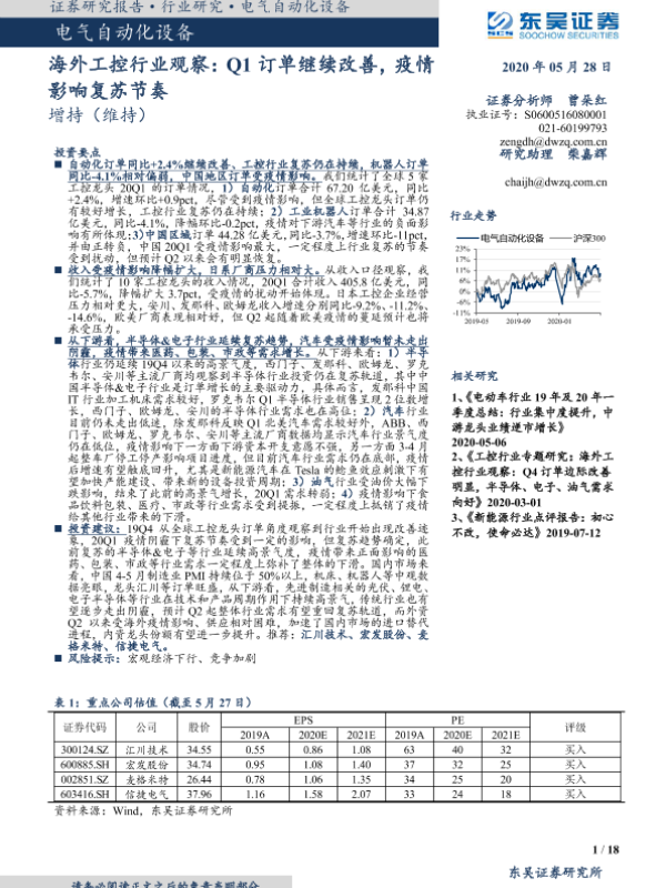 【东吴证券】【20200528】海外工控行业观察:Q1订单继续改善,疫情影响复苏节奏-18页 行业研究