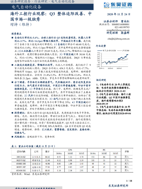 【东吴证券】【20201124】海外工控行业观察:Q3整体边际改善、中国市场一枝独秀-18页 行业研究