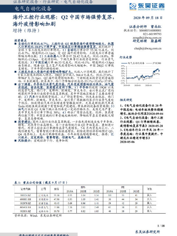 【东吴证券】【20200918】海外工控行业观察:Q2中国市场强势复苏,海外疫情影响加剧-18页 行业研究