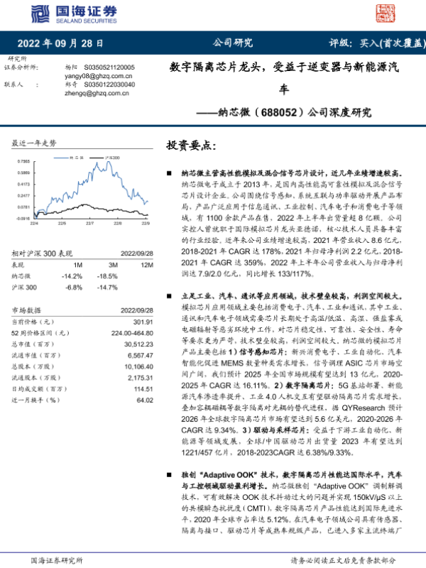 【国海证券】【20220928】公司深度研究:数字隔离芯片龙头,受益于逆变器与新能源汽车-34页 行业研究