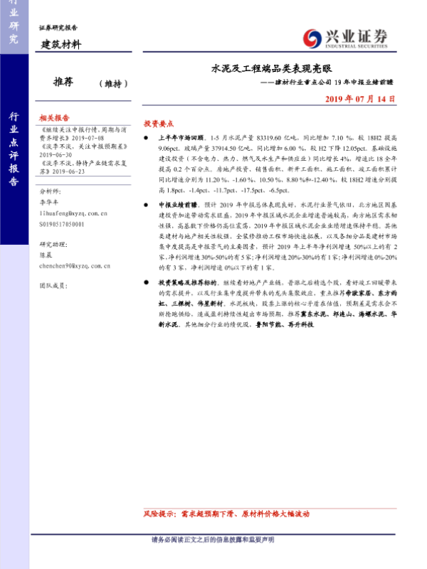 【兴业证券】【20190714】水泥及工程端品类表现亮眼-6页 行业研究