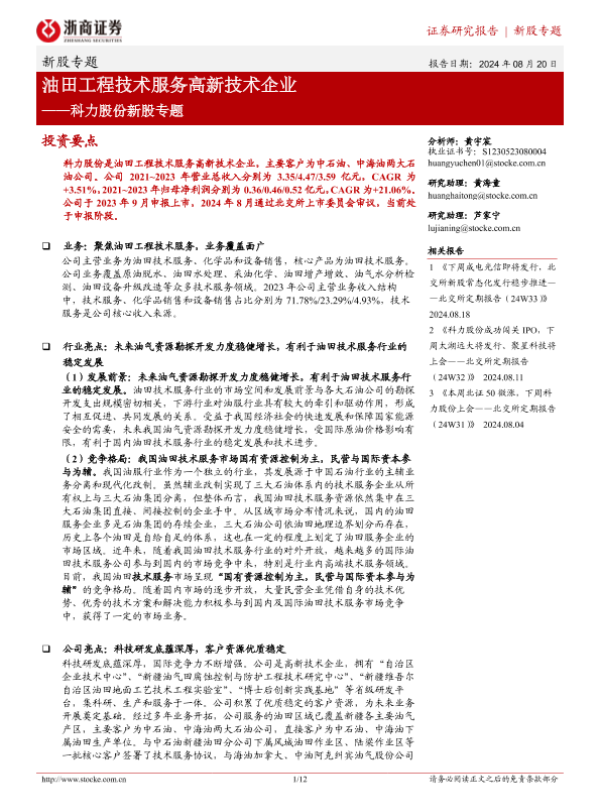 【浙商证券】【20240820】科力股份(873234)新股专题:油田工程技术服务高新技术企业-12页 行业研究