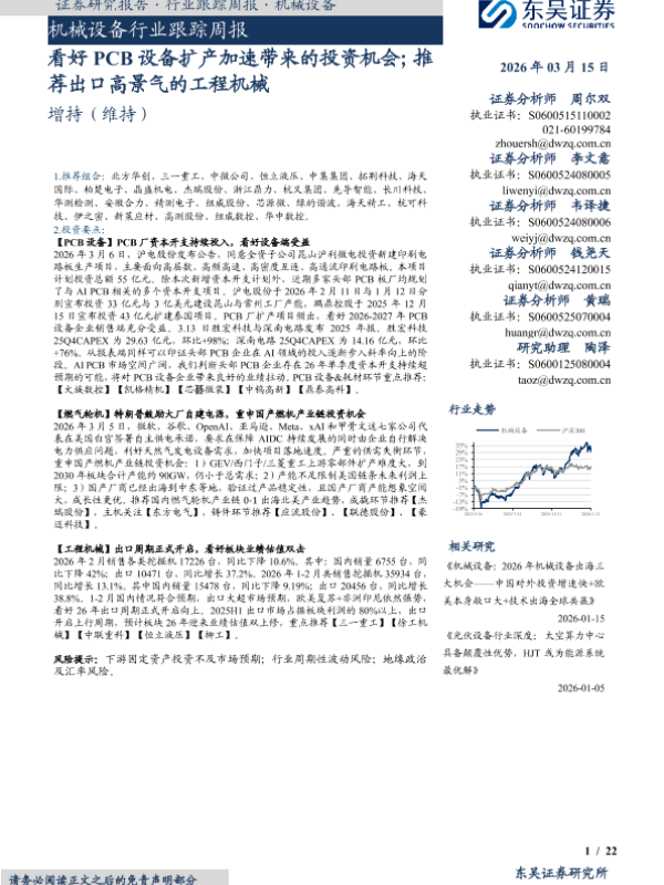 【东吴证券】【202603】看好PCB设备扩产加速带来的投资机会;推荐出口高景气的工程机械-22页 证券期货研究报告