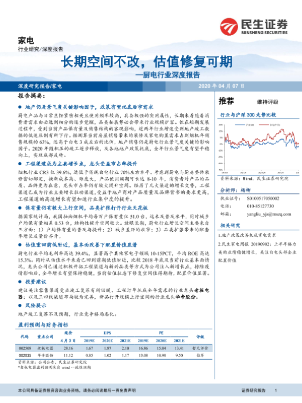 【民生证券】【20200407】20200407-民生证券-厨电行业深度报告:长期空间不改,估值修复可期-20页 行业研究