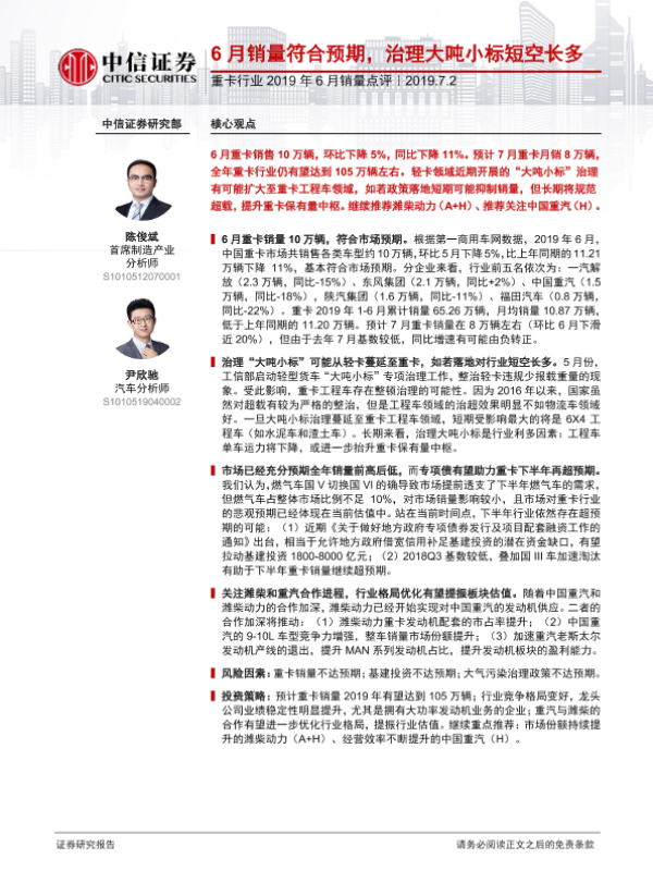 【中信证券】【20190702】重卡行业2019年6月销量点评:6月销量符合预期,治理大吨小标短空长多-2页 行业研究