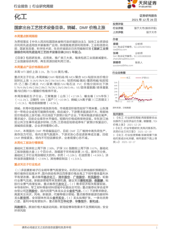 【天风证券】【20211226】化工行业研究周报:国家出台工艺技术设备目录,烧碱、DMF价格上涨-20页 行业研究