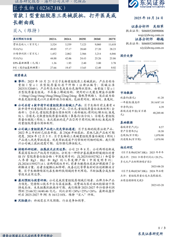 【东吴证券】【202510】首款Ⅰ型重组胶原三类械获批,打开医美成长新曲线-3页 证券期货研究报告