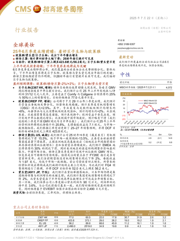 【招商证券国际】【20250722】全球美妆25年6月季度业绩前瞻:看好巨子生物与欧莱雅-12页 行业研究