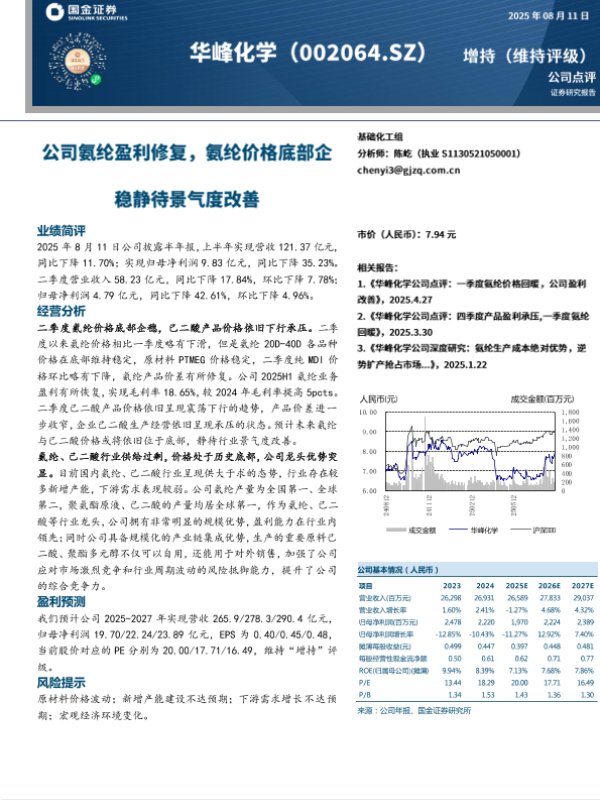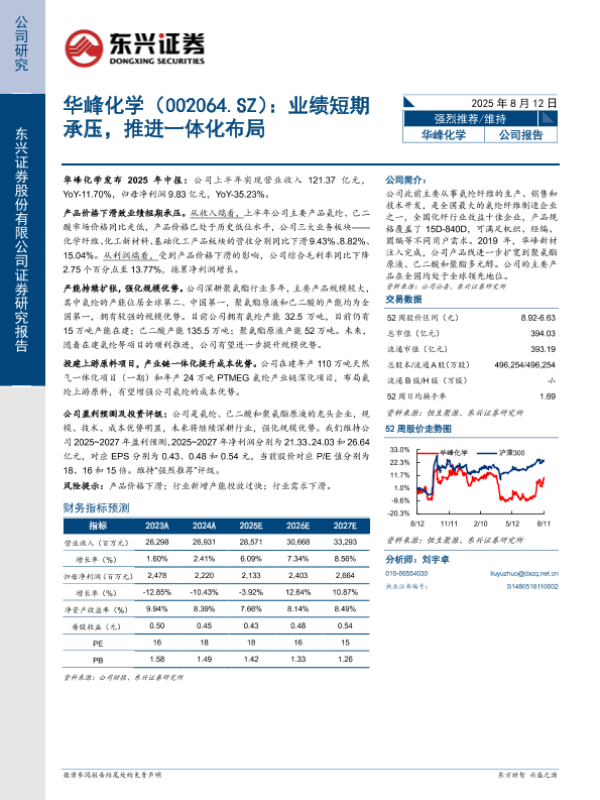 【东兴证券】【20250812】华峰化学:业绩短期承压,推进一体化布局-4页 公司研究